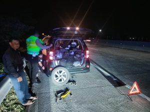 Tanpa canggung, petugas kepolisian membantu mendongkrak mobil dan mengganti ban cadangan milik korban. Langkah ini dilakukan agar kendaraan tidak terlalu lama berada di bahu jalan tol, yang berisiko memicu kecelakaan lalu lintas.