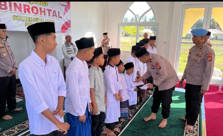 PIDIE JAYA.-suaramasyarakat.com.// Dalam rangka memperkuat keimanan serta menumbuhkan kepedulian sosial di lingkungan kepolisian, Kapolres Pidie Jaya AKBP Ahmad Faisal Pasaribu, S.H., S.I.K., M.H., diwakili oleh Wakapolres Kompol Iswahyudi, S.H., CPHR., CBA., melaksanakan kegiatan Bimbingan Rohani dan Mental (Binrohtal) serta santunan kepada anak yatim, yang digelar di Masjid Al Fahri Mapolres Pidie Jaya, pada Kamis, 10 Juli 2025 pukul 08.00 WIB.