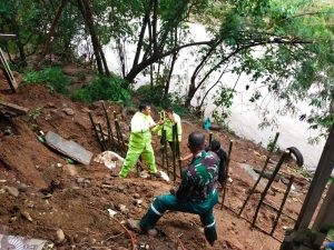 “Hari ini kami bersama rekan-rekan TNI dari Koramil, Pemerintah Desa, dan warga setempat melaksanakan pembuatan tanggul sementara. Area ini terdampak longsor pada Rabu pekan lalu, sehingga jika tidak segera kita tanggul menggunakan karung pasir dan cerucuk bambu, dikhawatirkan abrasi sungai akan semakin mendekati pemukiman warga,” ujarnya.