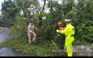 SUARAMASYARAKAT.COM//Polres Pekalongan  Polda Jateng – Hujan deras disertai angin kencang yang melanda wilayah Kecamatan Bojong, Kabupaten Pekalongan, pada Rabu (10/12/2025) siang, menyebabkan dahan pohon trembesi tumbang. Dahan berukuran besar tersebut melintang dan menutup setengah badan Jalan Raya Menjangan, sehingga mengganggu arus lalu lintas.