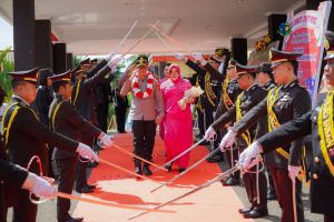 Dalam barisan penuh kehormatan, deretan perwira Polres membentuk formasi Pedang Pora, menyambut langkah-langkah terakhir AKBP Putu meninggalkan markas yang selama setahun lebih ia pimpin dengan dedikasi dan keteladanan.
