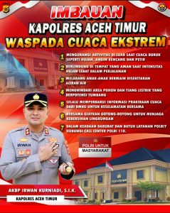 Kapolres Aceh Timur Melalui imbauan Kamtibmas, masyarakat diingatkan untuk; Pertama: Mengurangi aktivitas di luar rumah saat cuaca buruk seperti hujan lebat, angin kencang, dan petir; Kedua, Berlindung di tempat yang aman saat intinsitas hujan lebat dalam perjalanan; Ketiga, Melarang anak-anak bermain di sekitar aliran air; Keempat, Menghindari area pohon dan tiang listrik yang berpotensi tumbang; Kelima, Selalu memperbarui informasi prakiraan cuaca dari BMKG untuk keselamatan bersama; dan Keenam, Bersama giatkan gotong royong untuk menjaga kebersihan lingkungan.