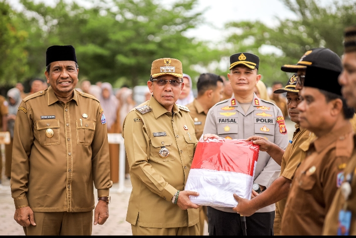 PIDIE JAYA.-suaramasyarakat.com.//  Menjelang peringatan Hari Ulang Tahun (HUT) ke-80 Republik Indonesia, Pemerintah Kabupaten (Pemkab) Pidie Jaya bersama Kepolisian Resor (Polres) Pidie Jaya menggelar Gerakan Pembagian Bendera Merah Putih, Senin (11/8/2025) pagi.