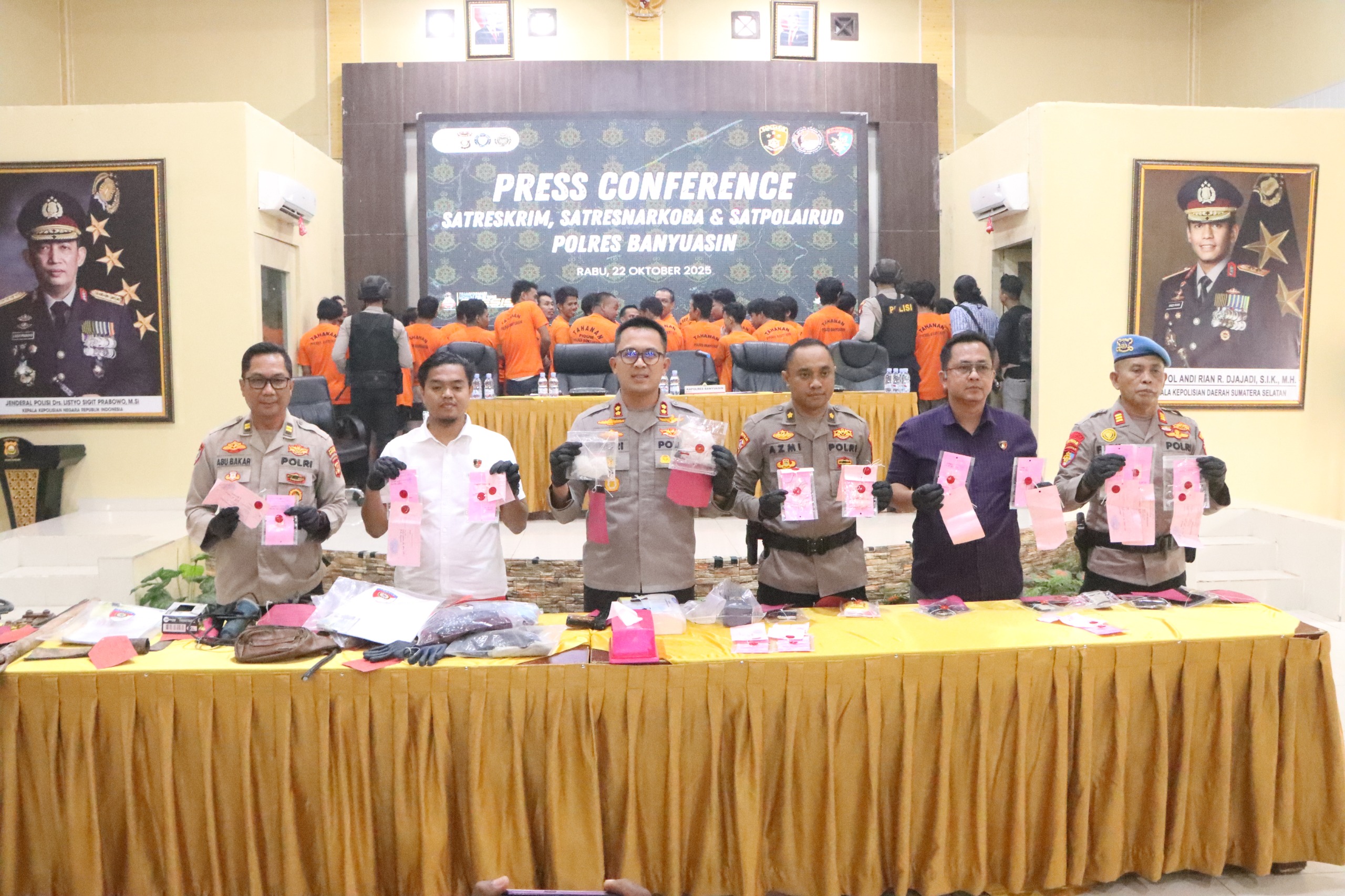 SUARAMASYARAKAT.COM.//Banyuasin– Polres Banyuasin berhasil mengungkap 34 kasus kejahatan yang terjadi selama September dan Oktober 2025. Berbagai kasus yang diungkap mulai dari narkoba, pencurian dengan pemberatan, hingga pembunuhan berencana, menunjukkan kinerja aktif dan sistematis jajaran kepolisian di bawah pimpinan Kapolres Banyuasin.