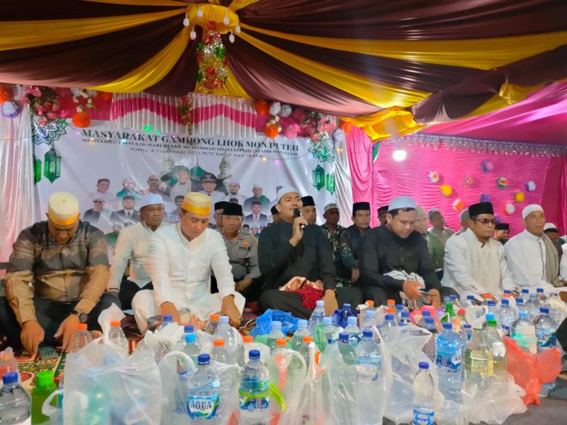 Lhokseumawe, Aceh – SuaraMasyarakat.com // Kapolres Lhokseumawe, AKBP Dr. Ahzan, S.H., S.I.K., M.S.M., M.H., hadiri peringatan Maulid Nabi Besar Muhammad SAW di Meunasah Gampong Lhok Mon Puteh, Kecamatan Muara Dua, Kota Lhokseumawe, Kamis malam (4/9/2025).