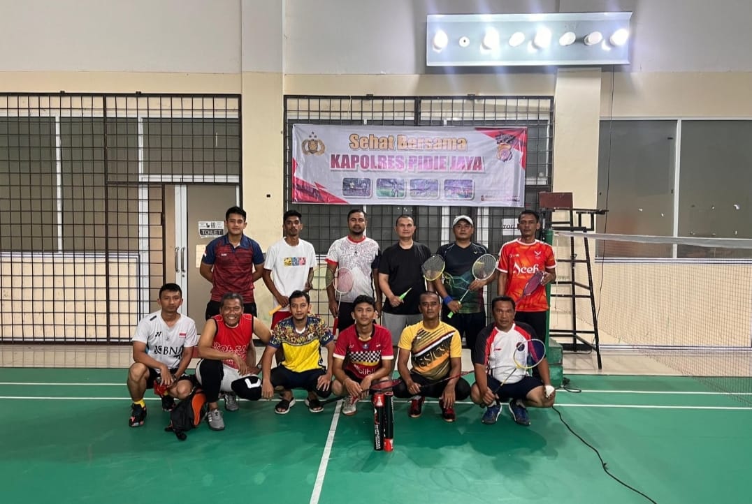 *PIDIE JAYA.- suaramasyaralat.com.// Dalam rangka menyambut Hari Bhayangkara ke-79, Kapolres Pidie Jaya, AKBP Ahmad Faisal Pasaribu, S.H., S.I.K., M.H., mengajak masyarakat dan personel Polres Pidie Jaya untuk berolahraga bersama di Gedung Olahraga (GOR) Badminton Komplek Perkantoran Pemerintah, Manyang Lancok, Kec. Meureudu, Kabupaten Pidie Jaya, Aceh, Rabu (11/6/2025).