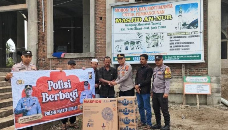 Untuk Jum’at Berkah kali ini Kapolsek Pantee Bidari menyerahkan bantuan berupa satu unit kipas angin dan air mineral di Mesjid An Nur, Gampong Meunasah Tunong Kecamatan Pantee Bidari, Kabupaten Aceh Timur. Jum’at, (12/09/2025).