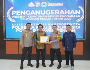 SUARAMASYARAKAT.COM///Palu – Ombudsman Republik Indonesia secara resmi menganugerahkan Predikat Kepatuhan Penyelenggaraan Pelayanan Publik Tahun 2025 kategori Kepolisian Resor kepada Polres Sigi. Penghargaan tersebut diterima langsung oleh Kapolres Sigi AKBP Kari Amsah Ritonga, S.H., S.I.K., M.H., dalam kegiatan penganugerahan di Aula Rupatama Polda Sulawesi Tengah, Selasa (3/2/2026).