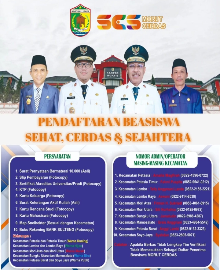 Pemerintah Kabupaten Morowali Utara mengimbau seluruh mahasiswa yang memenuhi syarat untuk segera melakukan pendaftaran serta memastikan kelengkapan berkas sebelum batas waktu yang ditentukan.