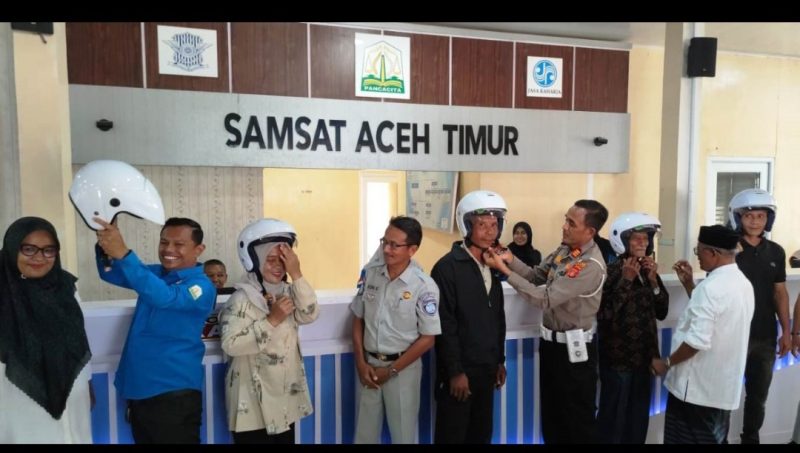 Aceh Timur – SuaraMasyarakat.com // Peringati Hari Keselamatan Lalu Lintas dan Angkutan Jalan (LLAJ) Nasional yang diperingati setiap tanggal 19 September, Satlantas Polres Polres Aceh Timur, Polda Aceh menggelar do’a bersama dan membagikan helm gratis kepada para wajib pajak yang taat membayar pajak kendaraan bermotor.