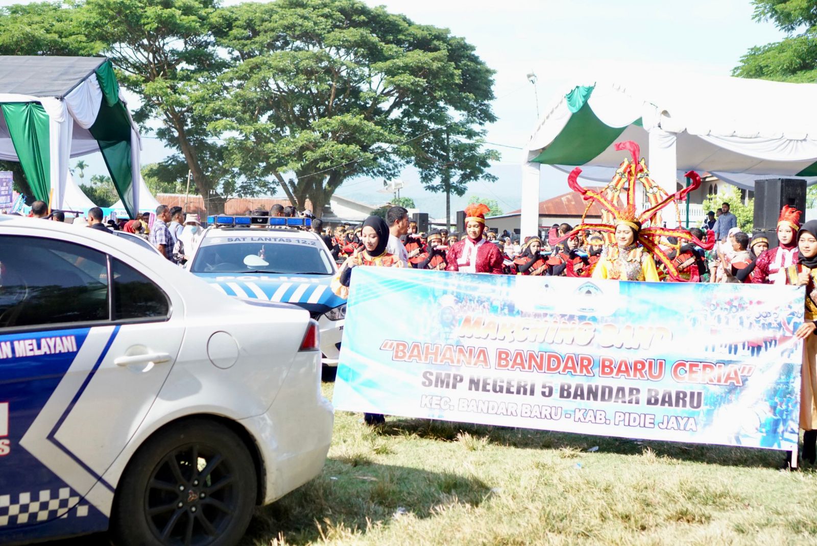 Kegiatan yang berlangsung meriah di Lapangan Bola Kaki Kota Meureudu itu diikuti ribuan peserta dari jenjang TK, SD/MI, hingga SMP dengan menampilkan beragam atraksi budaya dan kostum kreasi anak negeri.