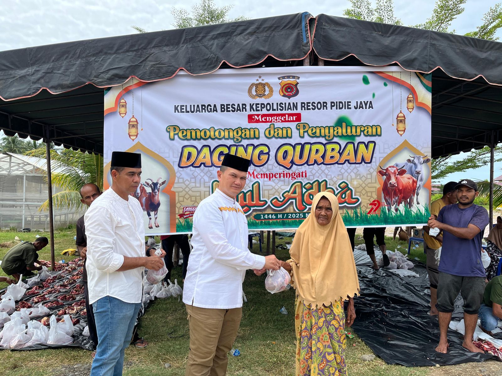 *PIDIE JAYA.-suaramasyarakat.com .//Dalam rangka memperingati Hari Raya Idul Adha 1446 H, Polres Pidie Jaya menunjukkan kepedulian sosial dengan menyalurkan 200 kantong daging qurban kepada warga kurang mampu di wilayah hukumnya, Jumat, 6 Juni 2025. Distribusi dilakukan melalui jajaran Polsek di delapan kecamatan, menyasar langsung rumah-rumah masyarakat yang membutuhkan.