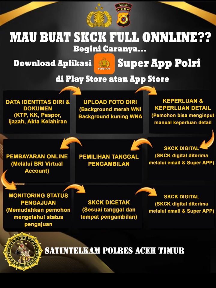 SUARAMASYARAKAT.COM//Aceh Timur, 15 Oktober 2025 — Kepolisian Negara Republik Indonesia (Polri) terus berinovasi dalam meningkatkan kualitas pelayanan publik melalui digitalisasi. Kini, proses pengurusan Surat Keterangan Catatan Kepolisian (SKCK) dapat dilakukan secara full online melalui aplikasi resmi Polri, Super App Presisi.