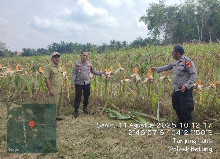 Banyuasin.-suaramasyarakat.com.//Kapolsek Betung Iptu Riady Sasongko SH, memimpin langsung pengecekan tanaman jagung di Lahan Ketahanan Pangan Poktan Serumpun 2 pada 11 Agustus 2025, Desa Tanjung Laut, Kecamatan Suak Tapeh, Kabupaten Banyuasin. Kegiatan ini dilakukan sebagai persiapan menuju Panen Raya Jagung Perdana yang direncanakan pada Rabu, 13 Agustus 2025.