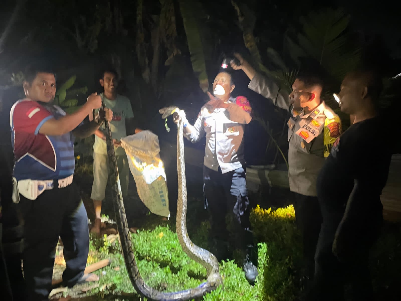 PIDIE JAYA.-suaramasyarakat.com.// Tim gabungan Kepolisian Resor (Polres) Pidie Jaya berhasil mengevakuasi seekor ular piton sepanjang empat meter dari rumah warga di Gampong Pangwa Kuta, Kecamatan Tringgadeng, pada Senin malam, 7 Juli 2025.