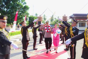 SUARAMASYARAKAT.COM///Polres Banggai menggelar tradisi penyambutan Kapolres Banggai baru AKBP Wayan Wayracana Aryawan, SIK, bersama Ketua Bhayangkari Cabang Banggai Ny. Made Wayan di Mapolres Banggai, Sabtu (10/1/2026).