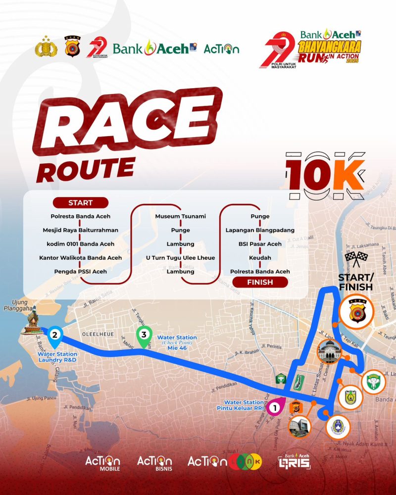 Zulhir menjelaskan, untuk kategori 5K, peserta akan menempuh rute mulai Polresta Banda Aceh – Masjid Raya Baiturrahman – Kodim 0101/Banda Aceh – Kantor Wali Kota Banda Aceh – Pengda PSSI Aceh – Museum Tsunami Aceh – Punge – Asrama Polisi (berbalik) – Lapangan Blang Padang – BSI Pasar Aceh – Keudah – dan kembali finis di Polresta Banda Aceh.
